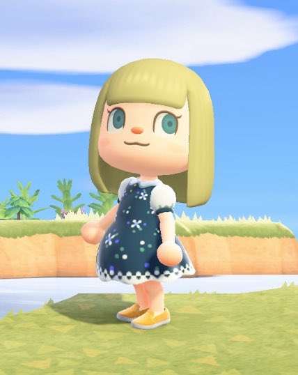 タクミさんのウィッグに合わせた水色ドットのワンピース。背中が寂しかったのでリュック付き!襟をつめたらどうぶつ達にもいけそうでした(*'ω'*)QRコードは水色のものです。#マイデザイン #どうぶつの森 pic.twitter.com/iRdFBXLKg6